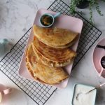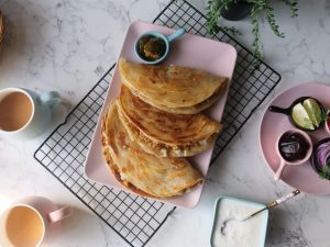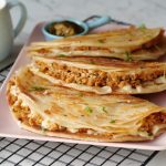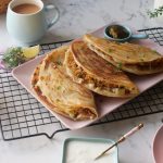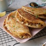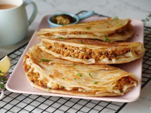 -Spread prepared chicken filling on one side, add mozzarella cheese & flip the other side of paratha over it. Press gently & cook from both sides until golden & crispy (makes 10).