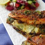 -Brush prepared garlic oil on top of stuffed chicken & insert toothpick or skewer to seal the stuffing.