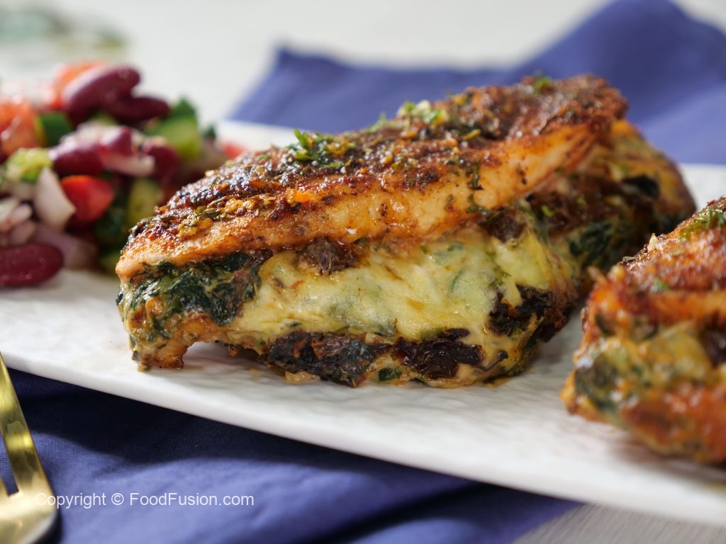 -Now add prepared cheesy creamed spinach on one side,mozzarella cheese,sun-dried tomatoes,fresh parsley & cover with other side of chicken fillet.