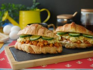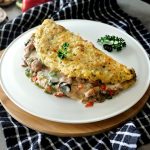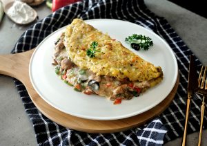 Omelet ki half side per cheddar cheese,tayyar stuffing aur mozzarella cheese dal dein.