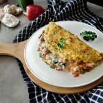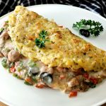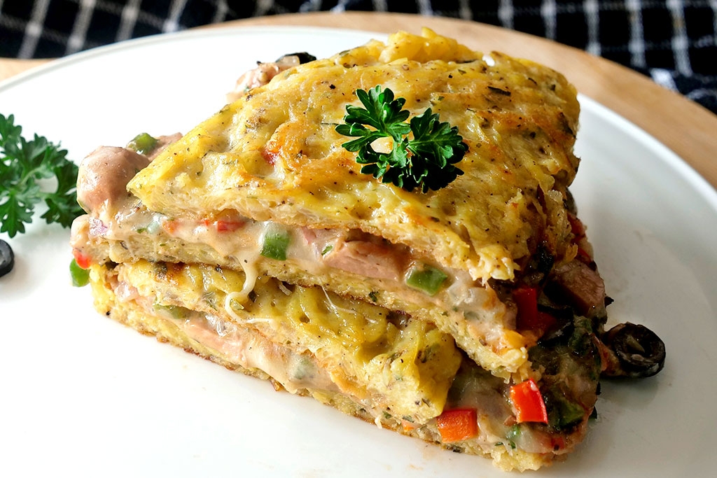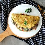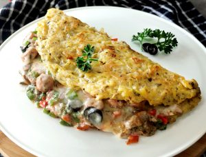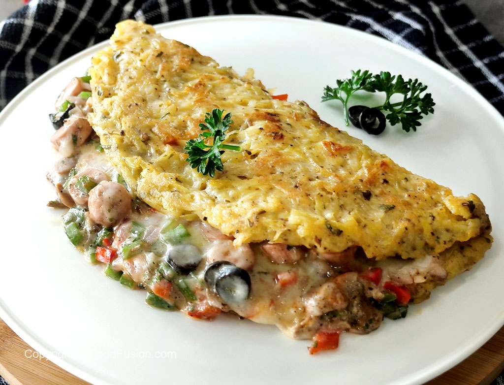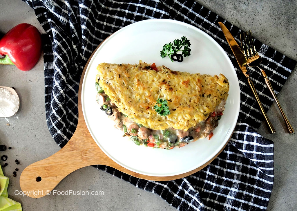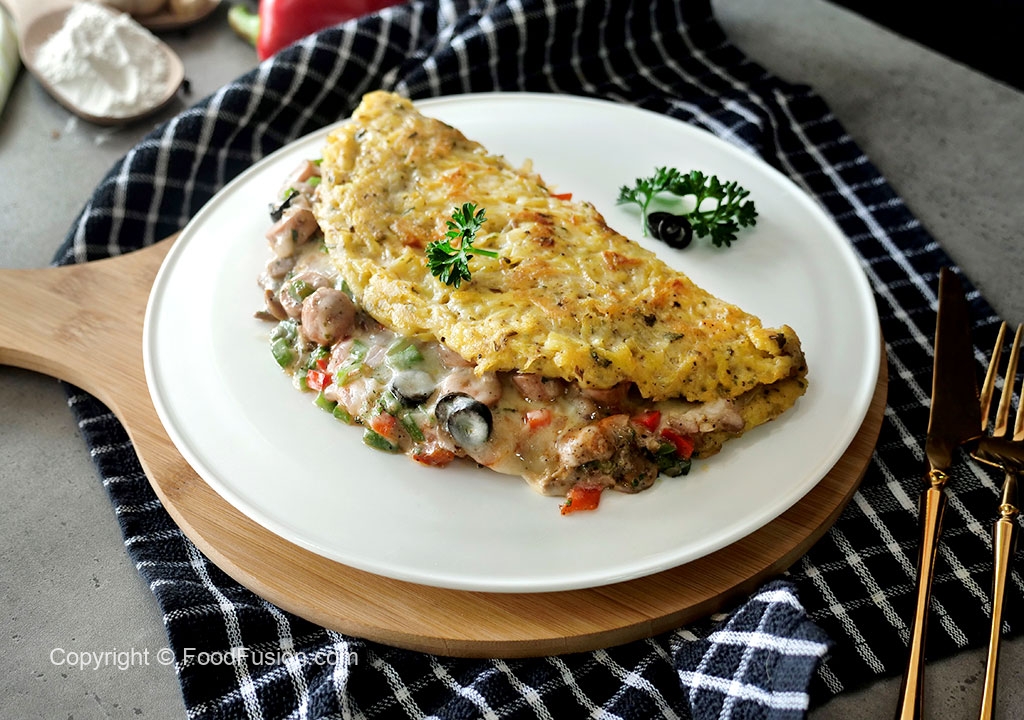 On half side of omelet,add cheddar cheese,prepared sausages filling and mozzarella cheese.