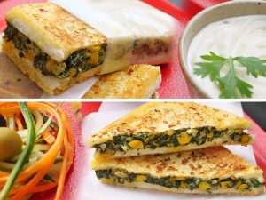 Plain side ko stuffing ka upper flip ker ka gently press lein aur dhak ker halki ancch per cheese melt ho janay tak paka lein (2 minutes) (makes 2-3).