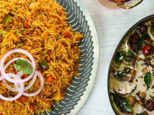 -Garnish tawa veg pulao with onion rings & serve with zucchini dahi.