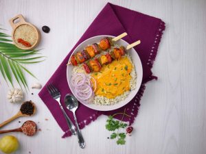 -In a serving bowl,add prepared rice,chicken tikka sticks,prepared creamy BBQ sauce,onion rings,fresh coriander & serve!