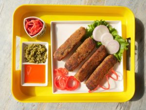 Grease hands with oil and set the mixture on skewers and give them rest for 10 minutes to settle.