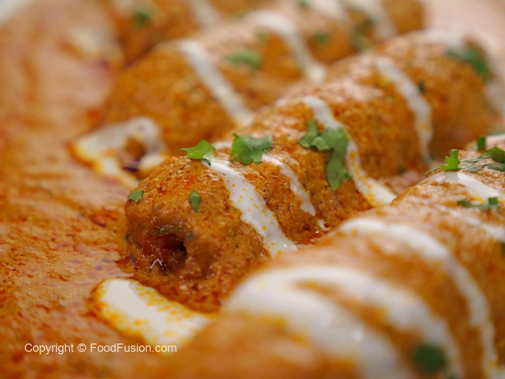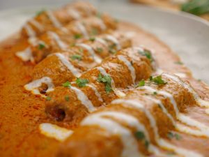 -In a serving platter add vegetable seekh kabab, pour gravy over kabab, garnish with cream & fresh coriander, serve with naan!