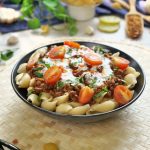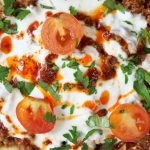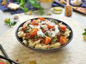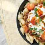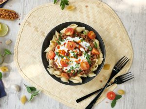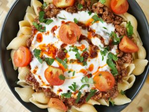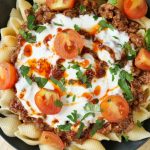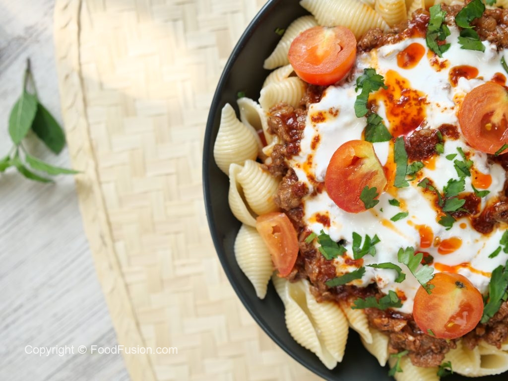 -In serving bowl,add boiled pasta,prepared mince,prepared yogurt sauce,prepared butter sauce,cherry tomatoes,fresh coriander & serve!