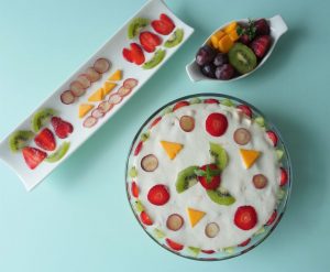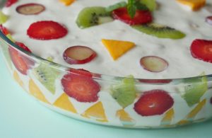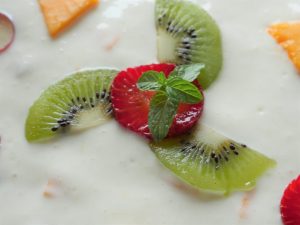 In serving dish,add banana,mango,strawberries,kiwi,prepared yogurt fruits & serve!